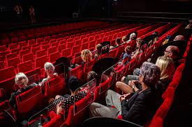 An old man lay awkwardly sprawled across three entire seats in the movie theater