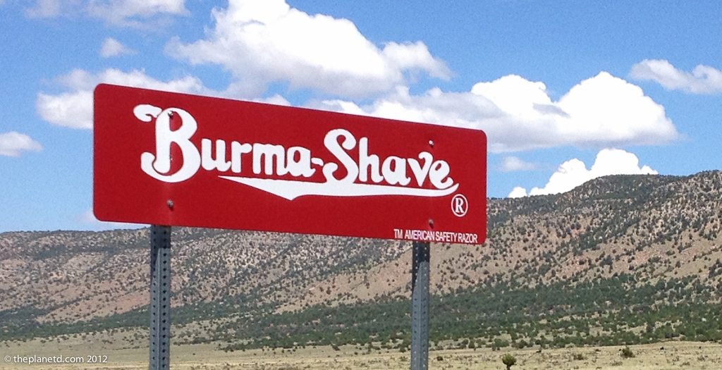 Before there were interstates, when everyone drove the old 2 lane roads, Burma Shave signs would be posted all over the countryside in farmers’ fields. They were small red signs with white letters. Five signs, about 100 feet apart, each containing 1 line of a 4-line couplet… and the obligatory 5th sign advertising Burma Shave, a popular shaving cream.